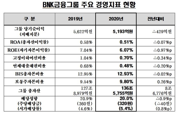 BNK금융그룹에 따르면 코로나19 영향에도 불구하고 여신 포트폴리오 개선과 철저한 건전성 관리로 건전성지표는 양호한 수준을 보이고 있다. 그룹 고정이하여신 커버리지비율도 123.58%로 전년 대비 24.46%p 개선됐다.