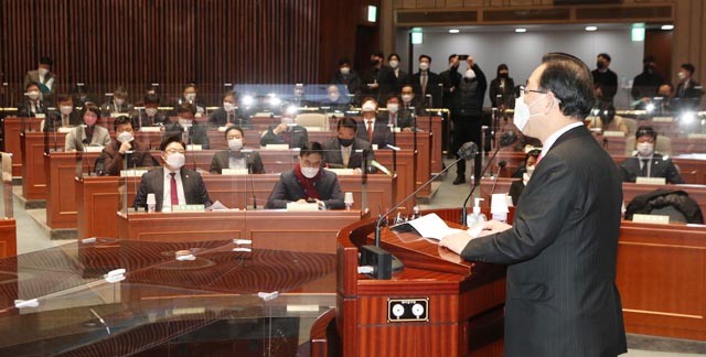 국민의힘 주호영 원내대표가 17일 국회에서 열린 정책 의원총회에서 발언하고 있다.
