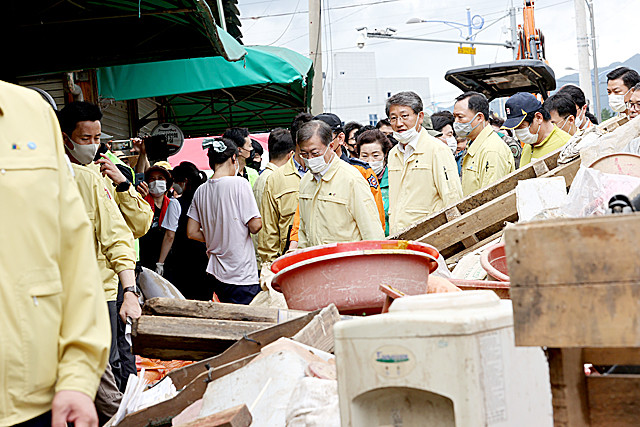 문재인 대통령이 12일 오후 전남 구례군 구례5일시장을 방문, 집중호우 피해현장을 둘러보고 있다.