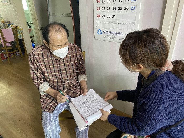 경기 연천군 전곡읍행정복지센터는 19일부터 전곡읍에 주소를 둔 주민 중 75세 이상 노인을 대상으로 공무원이 가구를 직접 방문해 코로나19 백신접종 동의를 받는다. 사진은 읍 관계자가 대상 노인을 방문해 동의서에 대해 설명하는 모습. (사진제공=연천군청)