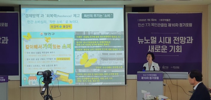 김수영 서울 양천구청장이 지난 2일 여주박물관에서 열린 민선7기 목민관클럽 제10차 정기포럼에서 ‘뉴노멀 시대 전망과 새로운 기회’를 주제로 포스트 코로나시대에 발맞춘 양천구의 대응전략을 발표하고 있다. 이날 김 구청장은 ‘착한소비 캠페인’과 일자리 뉴딜 사업 등을 소개했다.