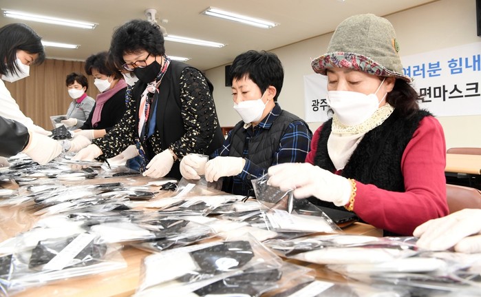 경기 광주시 여성단체협의회가 23일 광주시청을 방문해 (주)영광특수산업과 함께 제작한 필터교체형 면 마스크 1000장(500만원 상당)을 마스크 구입이 어려운 취약계층에 전달해 달라며 기탁했다. 사진은 마스크를 만드는 회원들의 모습. (사진제공=광주시청)