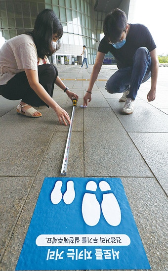 신종 코로나바이러스 감염증(코로나19) 사태로 중단됐던 수도권 소재 국립문화예술시설의 운영이 오는 22일부터 재개된다. 20일 서울 용산구 국립중앙박물관 매표소 앞 대기열에 직원들이 코로나19 예방을 위한 거리두기 안내 스티커를 붙이고 있다.