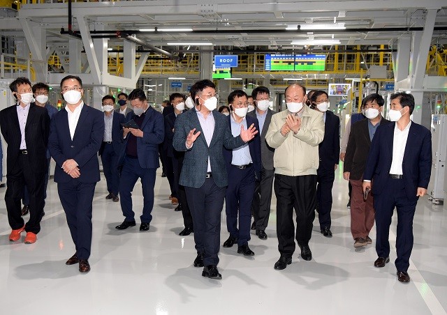 김종효 광주광역시 행정부시장(앞줄 가운데)이 2일 간부공무원들과 함께 광주글로벌모터스 공장을 방문해 박광태 광주글로벌모터스 대표이사로부터 시설에 대한 설명을 들으며 현장을 둘러보고 있다./광주광역시 제공 |