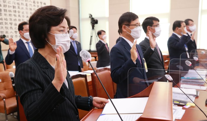 추미애 법무부 장관이 12일 국회 법제사법위원회의 법무부 국정감사에서 증인선서를 하고있다.
