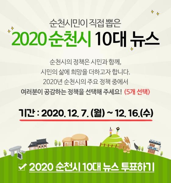 [순천=한행택 기자] 전남 순천시는 오는 7일부터 16일까지 10일간 '2020년 순천시 10대 뉴스' 선정을 위한 온라인 설문조사를 한다.