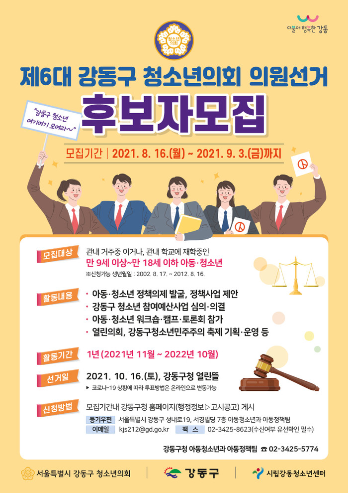 ‘제6대 강동구 청소년의회’는 직접선거를 통해 선출된 의원 25명과 비례의원 5명 내외로 구성되며, 아동권리와 정책에 관심 있는 사람은 누구나 지원할 수 있다.