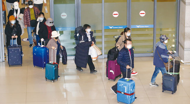 신종 코로나바이러스 감염증(코로나19)과 관련한 이스라엘의 입국 금지로 조기 귀국길에 오른 한국인 관광객들이 25일 오전 영종도 인천국제공항을 통해 귀국하며 입국장을 나서고 있다.
