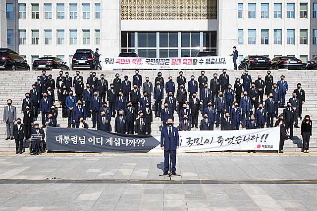 국민의힘 주호영 원내대표가 28일 국회 본청 앞 계단에서 열린 ‘북한의 우리 국민 학살만행 규탄 긴급의원총회’에서 규탄 발언하고 있다.