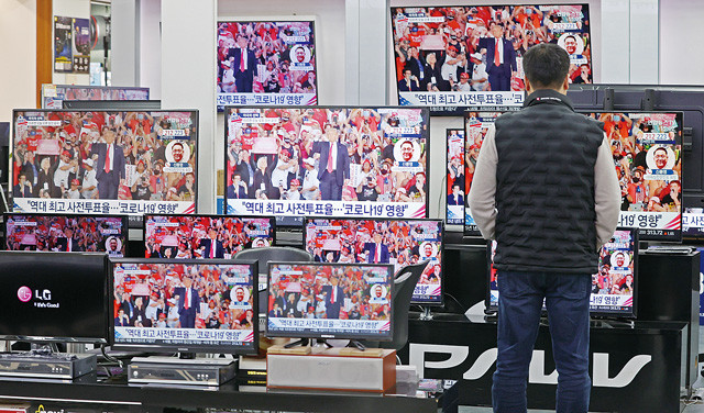 4일 오후 서울 용산구 전자랜드의 한 매장에 설치된 TV 화면에 11.3 미국 대선 개표 뉴스가 방송되고 있다.