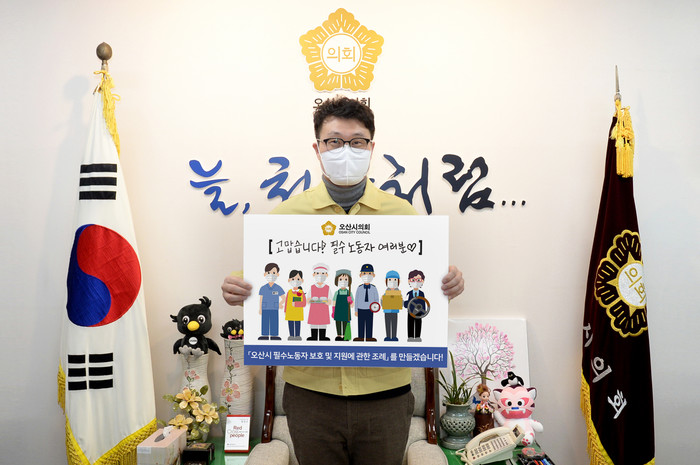 노상은 오산시사회복지사협회장과 김선조 오산시 복지교육국장의 지명을 받아 캠페인에 참여한 장인수 의장은 “코로나19 어려움 속에서 열심히 일하시는 필수노동자분들에 대한 사회적 관심과 평가가 높아지고 있지만, 아직도 많은 노동자분들이 고용불안과 열악한 노동환경 속에 어렵게 생계를 유지하고 있다”면서 “이번 응원 캠페인을 통해 필수노동자에 대한 응원과 감사의 마음이 전달되었으면 한다”고 말했다.
