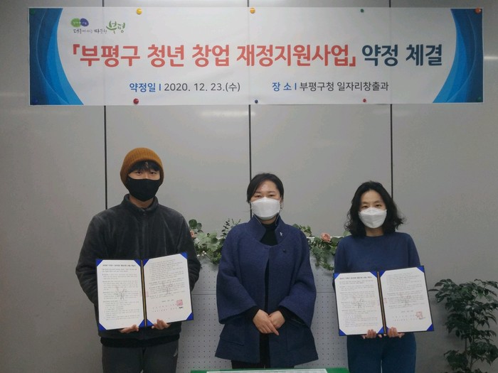 인천 부평구가 23일 구청에서 '청년 창업 재정지원 사업' 선정자 6명과 서면으로 약정을 체결했다. 이날 약정 체결에 따라 구는 선정된 청년 창업자들에게 임차료와 시제품 제작비 등 초기 창업자금으로 1년간 최대 1200만원을 지원하고 맞춤형 컨설팅을 제공한다. 사진은 관계자들이 기념촬영을 하는 모습. (사진제공=인천 부평구청)
