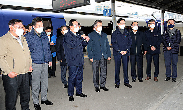 문재인 대통령(왼쪽 네 번째)이 25일 부산 부전역에서 열린 ‘동남권 메가시티 구축 전략 보고’에 참석, 부전역 플랫폼에서 울산광역시 송철호 시장(왼쪽 세 번째)의 ‘생활 행정공동체 전략보고’를 듣고 있다.