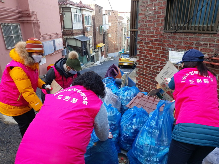 인천 중구 도원동지역사회보장협의체는 14일 중구 자원봉사센터, 중구 환경관리과와 협력해 주거환경 개선 사업을 진행했다. 사업 지원대상자는 홀로 사는 청장년 1인 가구로서 오랜 기간 집안 내부를 청소 하지 않은 상태로 음식물 쓰레기 및 생활쓰레기와 함께 생활하고 있어 개인 위생 및 질병에 노출되기 쉬운 상황에 놓여 있었다. 사진은 참여자들이 쓰레기를 치우고 있는 모습. (사진제공=인천 중구청)
