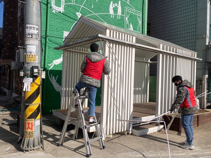 경기 동두천시 생연2동 주민자치위원회는 최근 생연2동 4통 마을 주민쉼터를 재정비했다. 사진은 이날 주민자치위원과 주민들이 노후돼 칠이 벗겨지고, 조명이 탈락된 쉼터 구조물을 정리하는 모습. (사진제공=동두천시청)