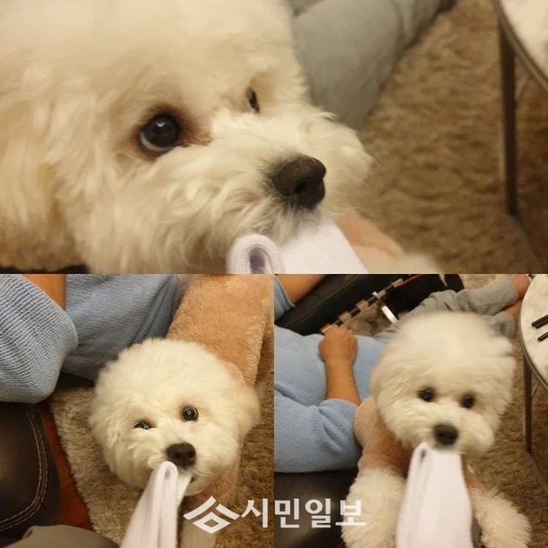 공개된 사진 속에는 반려견 두부가 양말을 물어뜯는 사랑스러운 모습이 담겨 훈훈함을 자아냈다.