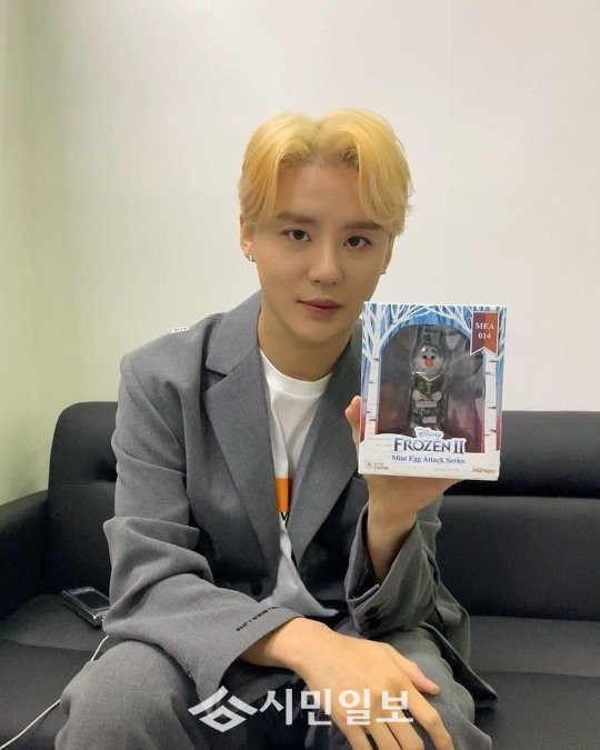 공개된 사진 속 김준수는 올라프 인형을 들고 귀여움을 드러내 여심을 사로잡았다.
