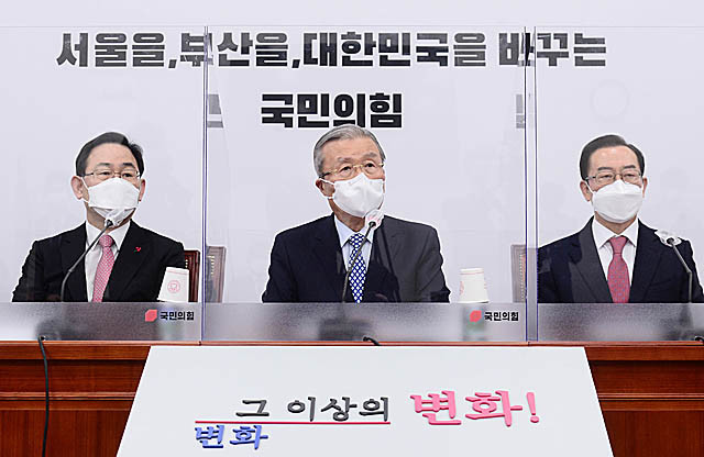 국민의힘 김종인 비상대책위원장이 15일 오전 서울 여의도 국회에서 열린 비상대책위원회의에서 발언하고 있다.