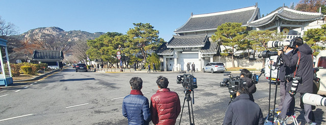 유재수 부시장 감찰 중단과 관련해 대통령비서실 압수수색을 시작했다고 4 밝혔다. 이날 오전 청와대 춘추관 앞에서 취재진이 연풍문 방향을 보고 있다.