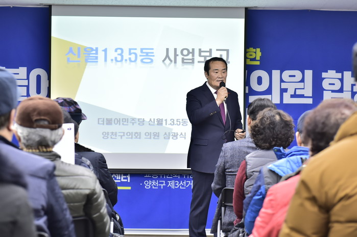 [시민일보 = 이대우 기자] 심광식 서울 양천구의원(더불어민주당·신월1·3·5동)이 최근 신월1동 주민센터 강당에서 의정보고회를 열고 그동안의 의정활동에 대해 주민들에게 설명했다.