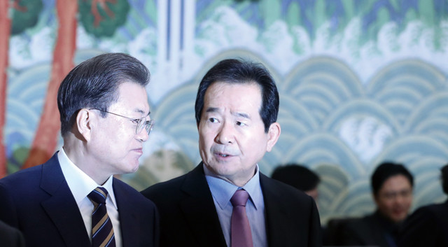 문재인 대통령과 정세균 국무총리가 18일 청와대에서 열린 국무회의에 입장하고 있다.