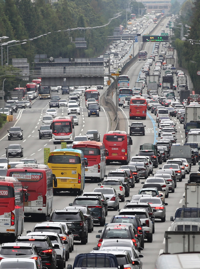 3일 오전 서울 서초구 잠원IC에서 바라본 경부고속도로 상(왼쪽)·하행선의 모습. 김 총리는 이날 정부세종청사에서 주재한 코로나19 대응 중앙재난안전대책본부(중대본) 회의에서 "지난 금요일 하루 고속도로 통행량이 531만대로 여름 휴가철 중 역대 최대치를 기록했다"며 "이번 휴가만큼은 '함께 하는 시간'보다 '휴식하는 시간'으로 보내주실 것을 간곡히 부탁드린다"고 말했다.