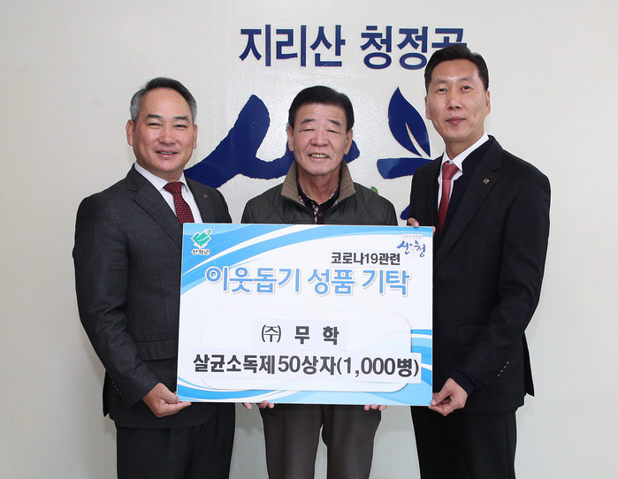 ㈜무학(회장 최재호)이 산청군을 찾아 코로나19 예방을 위해 써 달라며 식용 주정을 이용해 만든 분사형 살균 소독제 1000병을 전달했다.