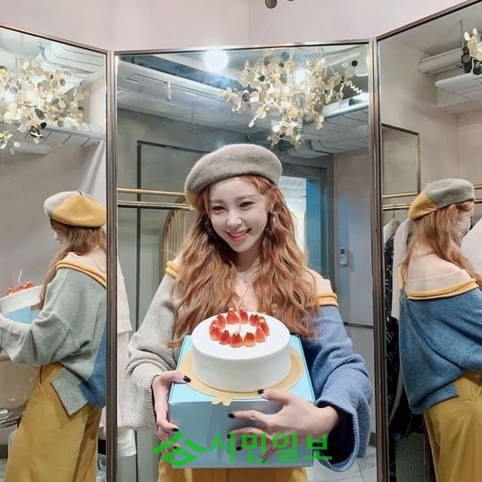 사진 속 전효성은 깜찍 베레모를 쓰고 여러 포즈를 취하고 있는 모습. 커다란 케이크도 시선을 사로잡는다.