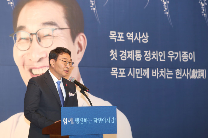 마지막으로 단상에 오른 우기종 전 전남 정무부지사는“함께 행진하는 담쟁이처럼’이라는 책 제목을 가리키며 “제가 경제정책 전문가, 예산전문가이지만 혼자서 다 할 수는 없다”고 강조하면서“목포에서 제가 하고자 하는 일도 여러분이 도와주셔야 제가 힘을 내서 성취할 수 있다.”라며 인사말을 마쳤다.