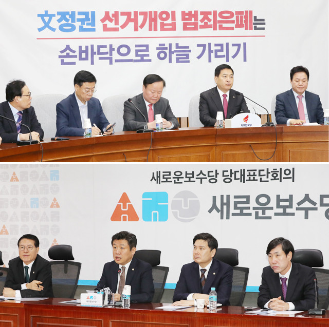 자유한국당 심재철 원내대표가 11일 오전 서울 여의도 국회에서 열린 원내대책회의에서 발언하고 있다(위). 새로운보수당 유의동 책임대표가 11일 오전 서울 여의도 국회 의원회관에서 열린 당대표단 회의에서 발언하고 있다.