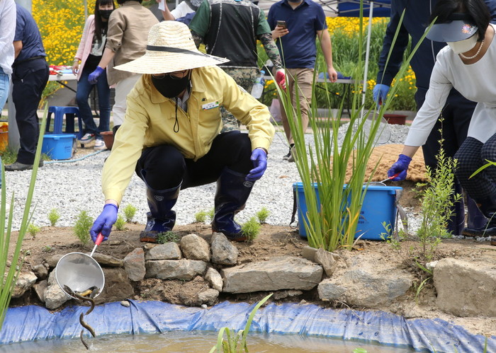 서울 금천구가 5일 안양천에서 '생태텃논' 개장식을 열고 주민들에게 개방했다. 이날 개장식은 유성훈 구청장을 비롯해 구립 및 민간 어린이집 원장 등이 참석한 가운데 모심기, 미꾸라지 및 논 우렁이 방사 등을 진행했다. 사진은 유 구청장이 미꾸라지를 방사하는 모습. (사진제공=금천구청)