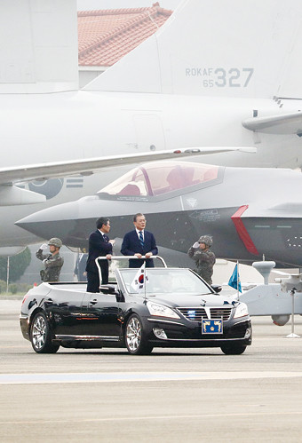 대통령이 1 대구 공군기지에서 열린 국군의 행사 지상사열을 하고 있다. 이번 지상사열은 육·해·공군 전력 4제대로 공중·대공방호·미사일 타격·대화력전 타격 자산 순으로 구성됐다.