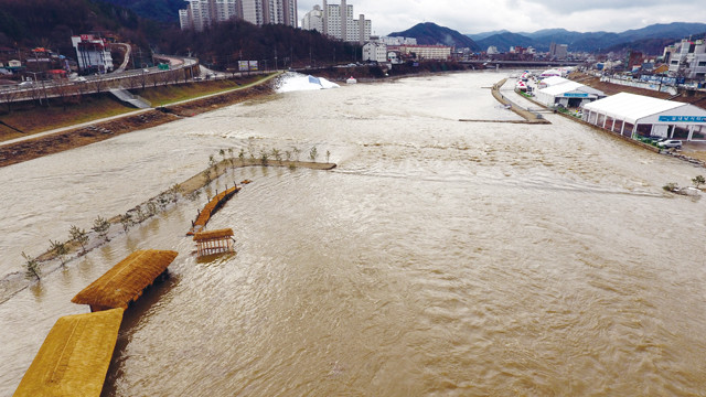 강원 홍천군 홍천읍 홍천강에서 개막(10)하려던 홍천강 꽁꽁축제장이 물이 넘쳐 침수되는 피해가 발생했다.
