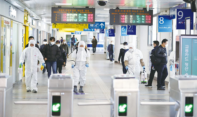 코레일 관계자들이 11일 오후 신도림 코리아빌딩 관련 코로나19 확진자 동선으로 확인된 서울 지하철 1호선 구로역에서 방역 작업을 하고 있다.