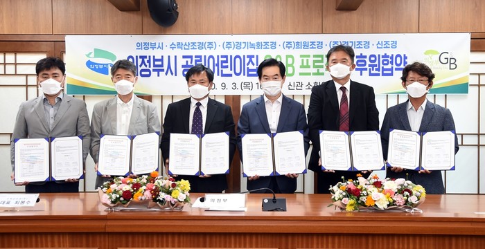 경기 의정부시는 3일 지역 조경전문 5개 기업과 의정부시 공립어린이집 'Green&Beauty 프로젝트 후원협약'을 체결했다. 협약에 따라 2년간 의정부시 공립어린이집 5곳(어룡어린이집 등)에 조경시설 정지·정전작업 및 초화류 등을 식재하기로 했다. 사진은 협약식에서 안병용 시장(오른쪽에서 세 번째)이 관계자들과 기념촬영을 하고 있는 모습. (사진제공=의정부시청)