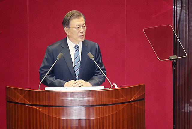 문재인 대통령이 28일 오전 서울 여의도 국회에서 2021년도 예산안 시정연설을 하고 있다.