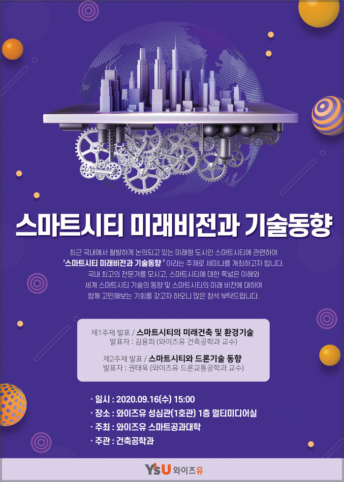 와이즈유(영산대학교, 총장 부구욱) 스마트공과대학 건축공학과와 드론교통공학과는 오는 16일 양산캠퍼스 성심관에서 ‘스마트시티 미래비전과 기술동향’을 주제로 온·오프라인 세미나를 개최한다.