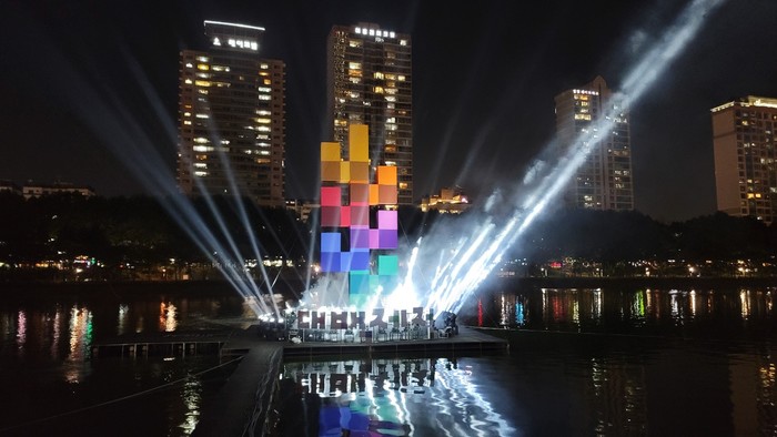 | ▲ 2021년 한성백제문화제 대백제전 일환으로 개최되는 ‘대백제 빛축제’. 석촌호수 동호 수변무대 앞에 설치된 칠지도 수상 조형물을 활용해 송파구는 축제 기간 중 매일 저녁 7~9시 레이져쇼를 펼친다. (사진제공=송파구청) |