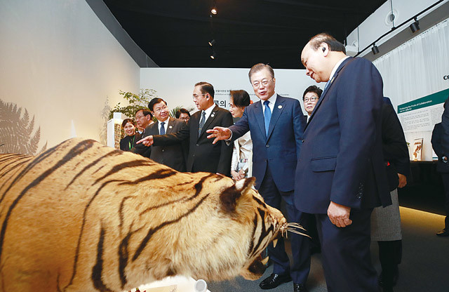 대통령이 27 오전 부산 누리마루에서 열린 -메콩 생물다양성협력 특별전에서 메콩강 유역 국가 정상과 함께 내부를 둘러보고 있다.