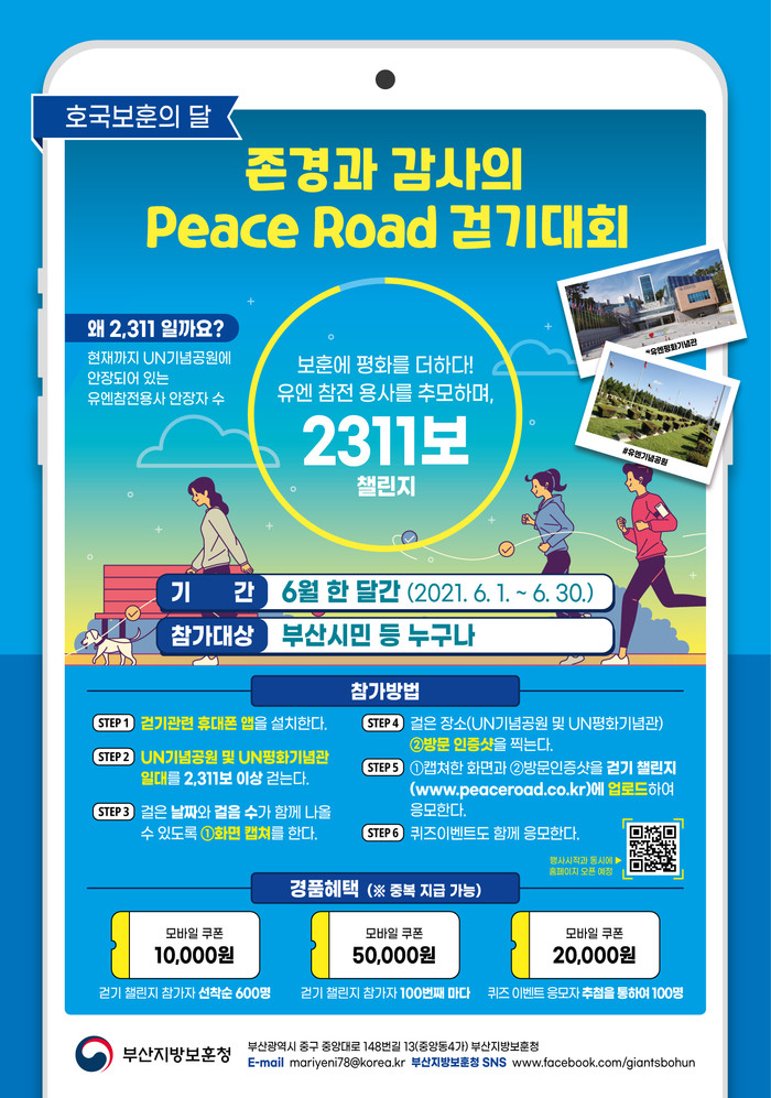 행사는 6월 1일(화)부터 6월 30일(수)까지 진행하며, 부산시민 등 누구나 참여 가능하다. 참가 방법은 UN기념공원 및 UN평화기념관 일대를 2,311보 이상 걸은 후 걸은 날짜와 걸음 수가 함께 나올 수 있도록 화면 캡쳐를 하고 방문 인증샷을 찍은 후, 캡쳐한 화면과 방문 인증샷을 걷기 챌린지 홈페이지 에 업로드하면 된다.