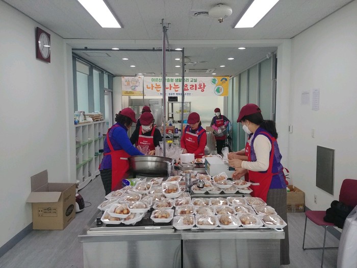 경기 양평군 청운면은 최근 '밑반찬 나눔 행사'를 실시했다. 이틀 동안 진행된 행사에는 청운면 지역사회보장협의체 이금순 위원장을 포함한 위원 11명이 밑반찬 만들기에 참여해 장조림, 나물, 고기 등을 조리했고, 오후에는 청운면사무소 직원이 직접 대상자 가정에 방문해 전달했다. 사진은 관계자들이 음식을 만들고 있는 모습.(사진제공=양평군청)