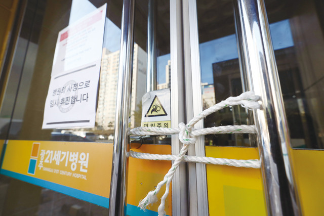 국내 16번째 신종 코로나바이러스 감염증 환자가 발생해 임시격리가 이뤄진 광주 광산구 21세기병원의 외부 출입문이 5일 밧줄에 묶여 있다.