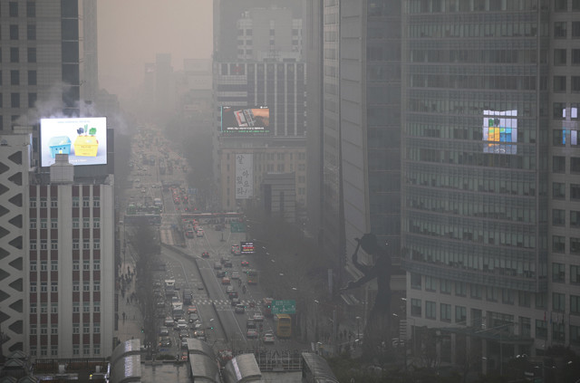 겨울 미세먼지 비상저감조치가 내려진 10 오전 서울시내 일대가 먼지로 뿌옇게 뒤덮여있는 가운데 서울시가 10 오후 1시를 기해 초미세먼지(PM-2.5) 주의보를 발령했다고 밝혔다. 이날 서울 25 자치구 초미세먼지 평균농도는 정오 83/, 오후 1 98/㎥를 기록했다.