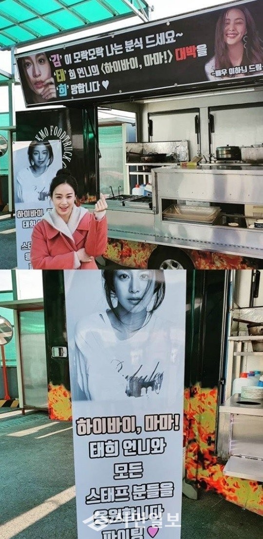 김태희는 자신의 인스타그램을 통해 "세트촬영 첫날, 너무나 맛있는 간식차로 응원해준 하늬~~덕분에 추위와 졸음을 이기고 다시 힘내서 촬영했다능ㅎㅎ정말 고마워~~^^!! #김태희#이하늬#하이바이마마"라는 글과 함께 두 장의 사진을 게재했다.