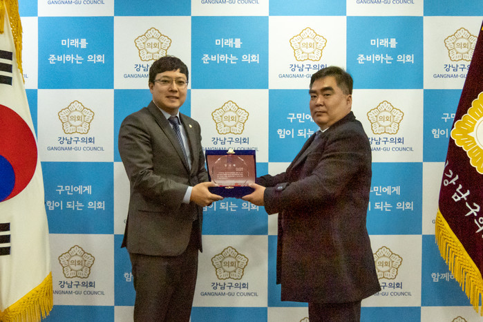 | ▲ 이관수 의장(오른쪽)이 대한민국 강남구도시관리공단 노동조합으로부터 감사패를 수상하고 있다. (사진제공=강남구의회) |