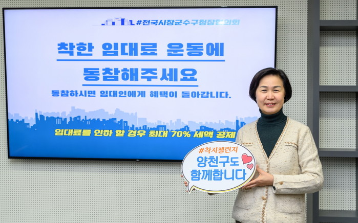 김수영 서울 양천구청장이 착한 임대인 운동이 전국적으로 확대돼 안정적으로 착지되기를 바라는 의미로 진행되는 #착지챌린지(착한 임대료 지원정책)에 동참했다.