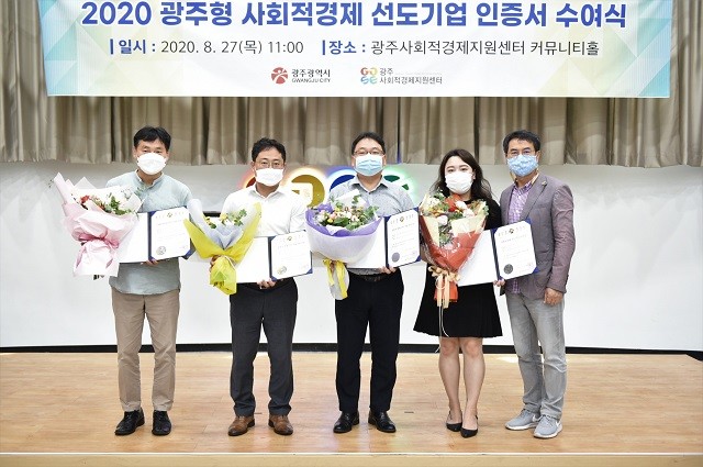 [광주=정찬남 기자] 광주광역시는 27일 광주사회적경제지원센터 커뮤니티 홀에서 올해 사회적경제 선도 기업으로 선정된 4개 기업에게 인증서를 수여했다.