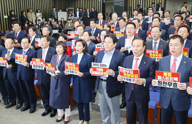 나경원 원내대표, 정양석 원내수석대표 의원들이 19 국회에서 열린 의원총회에서 ‘패스트트랙 원천무효, 공수처법 반대’ 피켓을 들어 보이고 있다.
