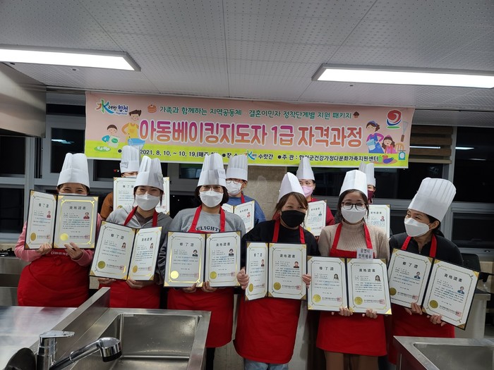 합천군(군수 문준희)가족센터는 지난 8월 10일부터 10월 26일까지 매주 화요일 총 10회기에 걸쳐 수려한 수랏간에서 아동베이킹지도자1급 자격취득과정을 운영한 결과 10명 모두 아동베이킹 지도사 1급 자격증을 취득했다.