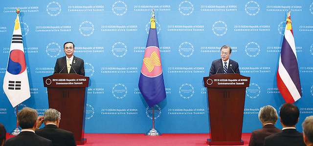 대통령이 26 오후 부산 벡스코 콘벤션홀에서 열린 2019 한·아세안 특별 정상회의 공동언론발표에서 발언하고 있다. 대통령과 아세안 정상들은 이번 특별정상회의 결과 문서로 ‘평화, 번영과 동반자 관계를 위한 한·아세안 공동비전 성명’ ‘한·아세안 특별정상회의 공동의장 성명’을 채택했다. 왼쪽은 아세안 의장국인 태국의 쁘라윳 짠오차 총리.